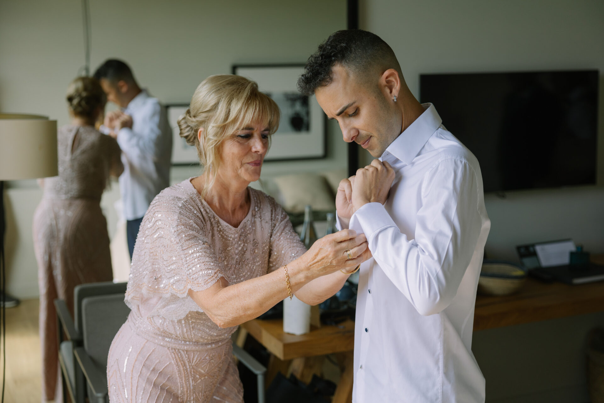 Allí tuvieron lugar los preparativos de ambos, que se rodearon de sus familiares más directos. Como siempre digo, en estos momentos, es mejor contar solo con la gente estrictamente esencial. Así te ahorras nervios y agobios que no son necesarios. Mira la naturalidad de ambos en los preparativos. Eso son caras de disfrute!