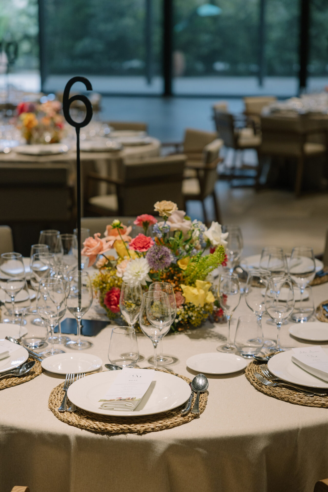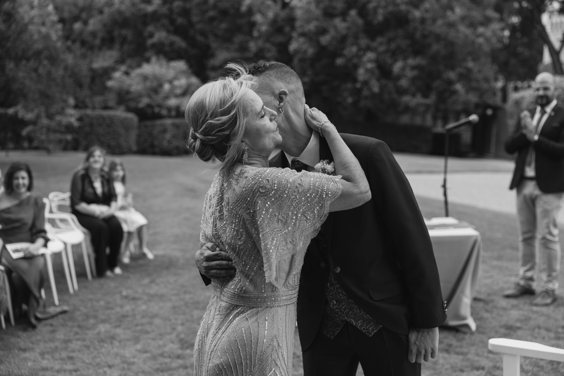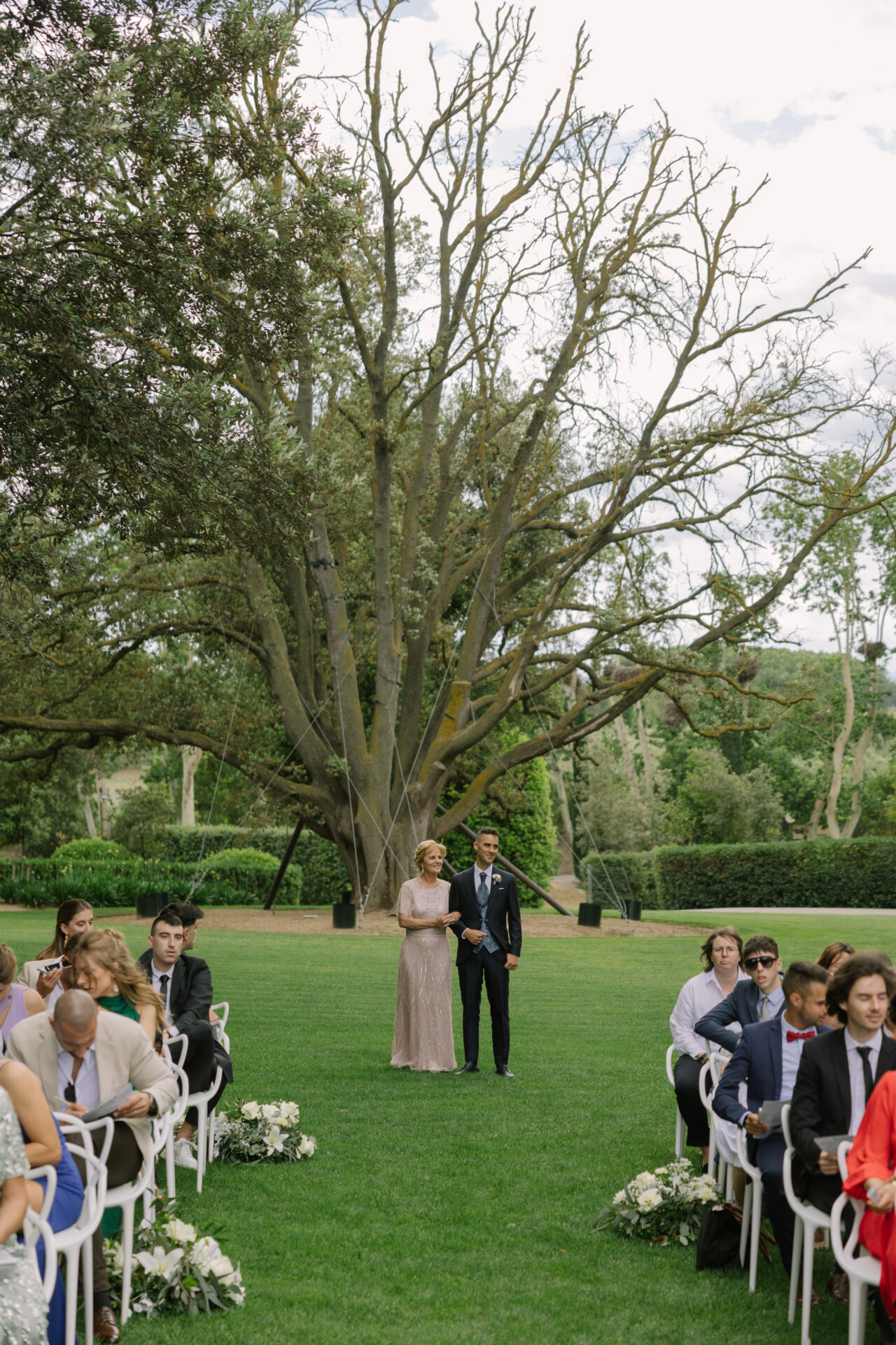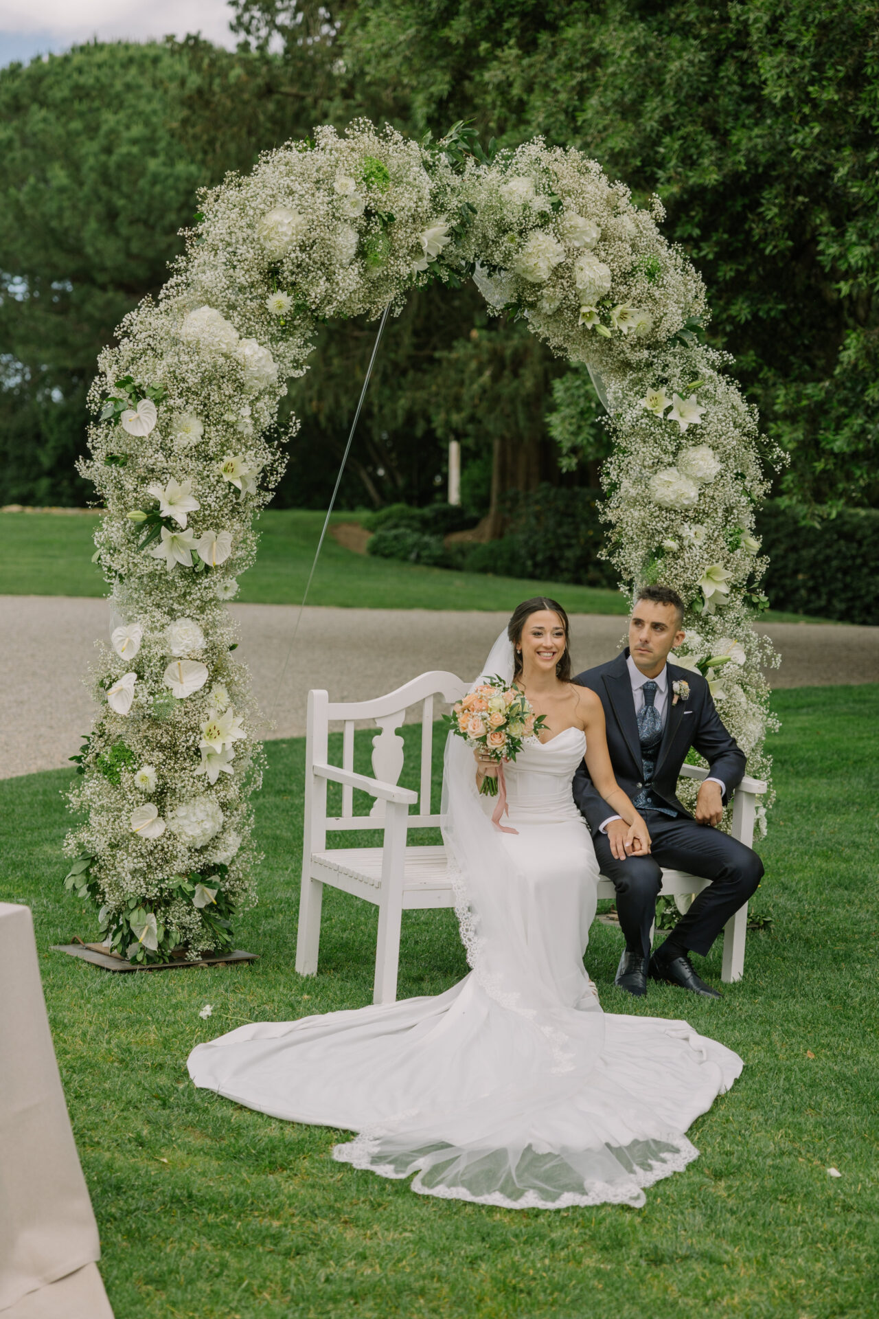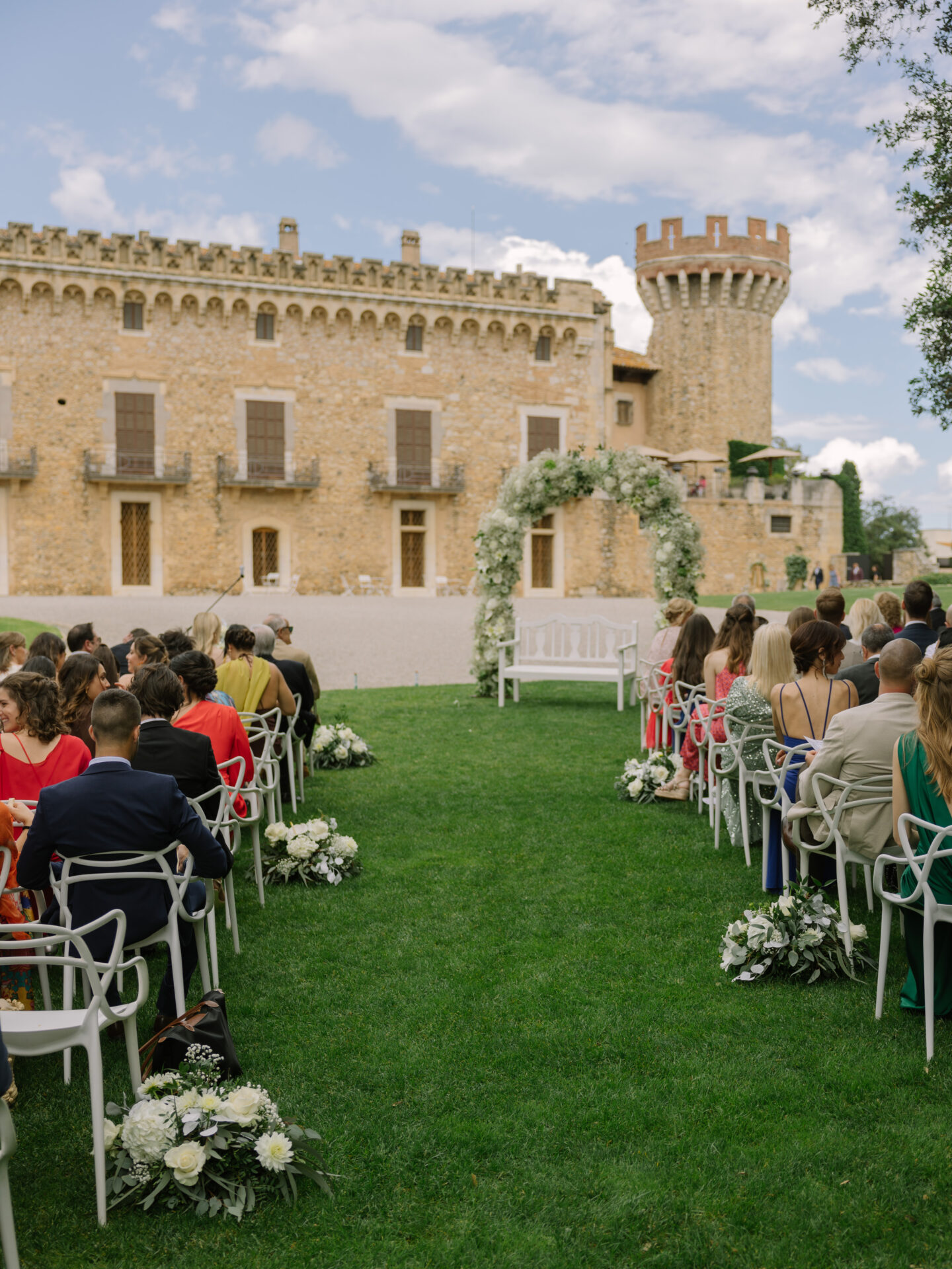 La ceremonia tuvo lugar en los jardines del propio Castell de Peralada, rodeados de vegetación, historia y una atmósfera mágica. Con un montaje simple pero cuidado hasta el último detalle con flores blancas.